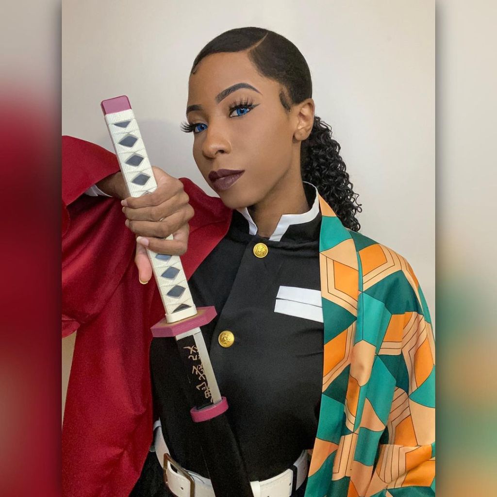 This is a super well done cosplay of Giyuu from CIR! Beautiful blue contacts make her glare enchanting, and mesmerizing. But don’t get too distracted, this demon slayer can strike fast!