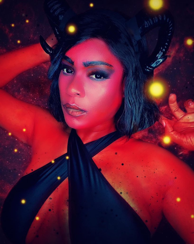 The combination of black and red color has always been menacing, and its possible to feel the evil vibes emitting from her intense gaze. The aura of flames around her and sharp black horns give signals of danger and to stay away.